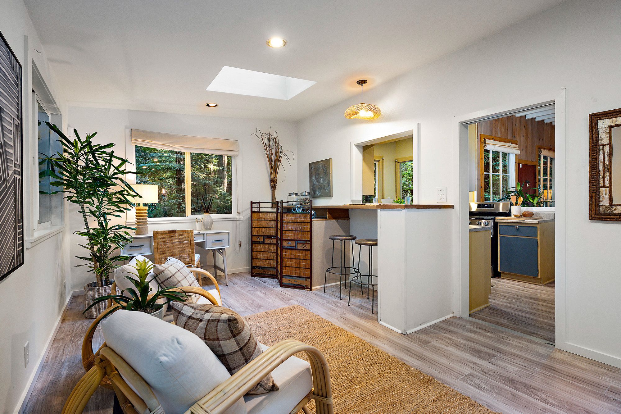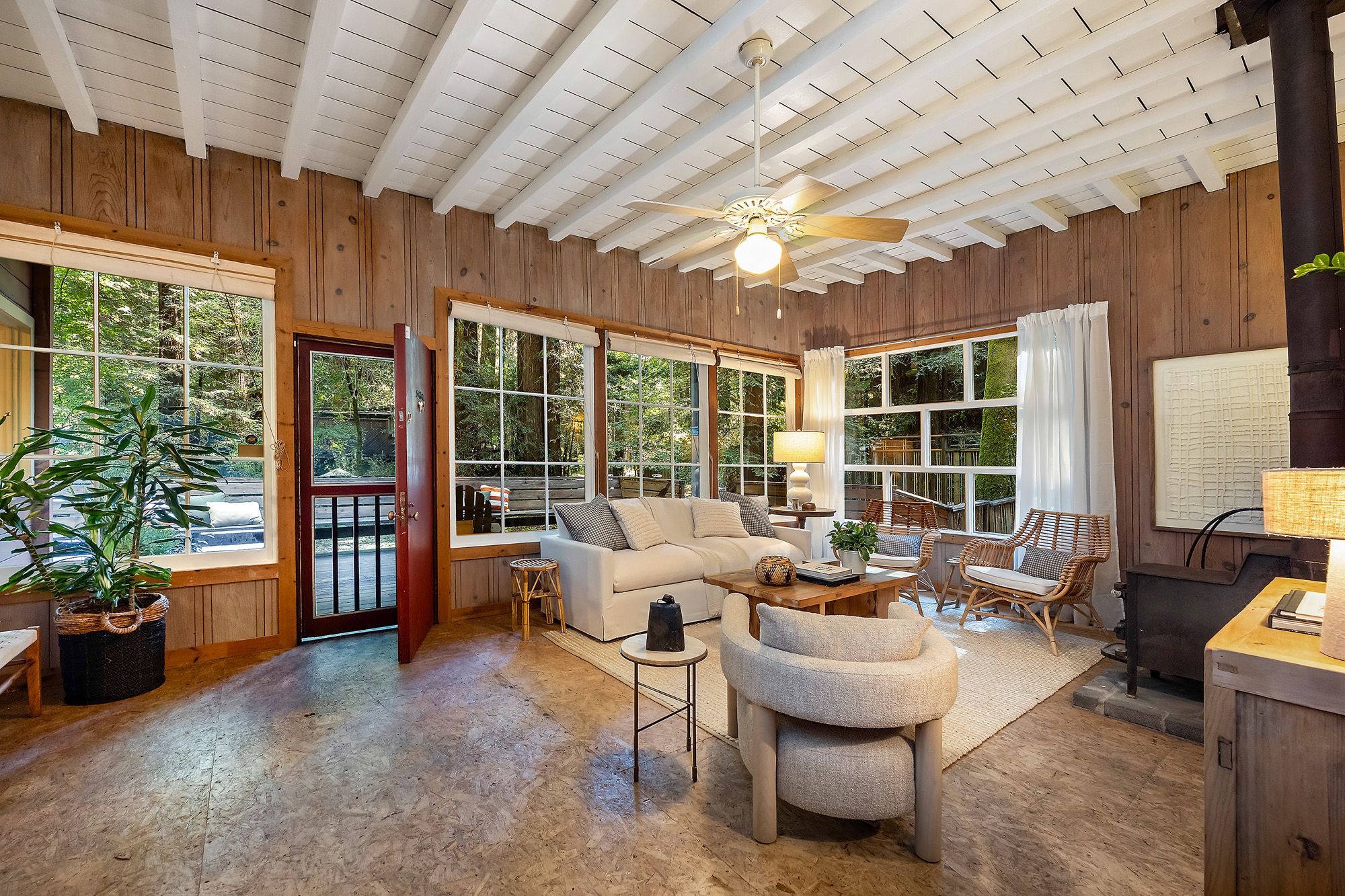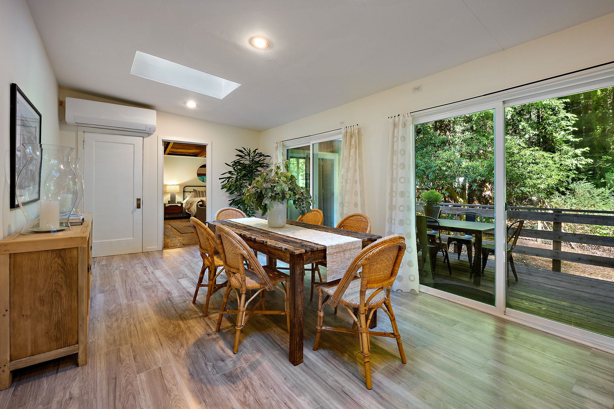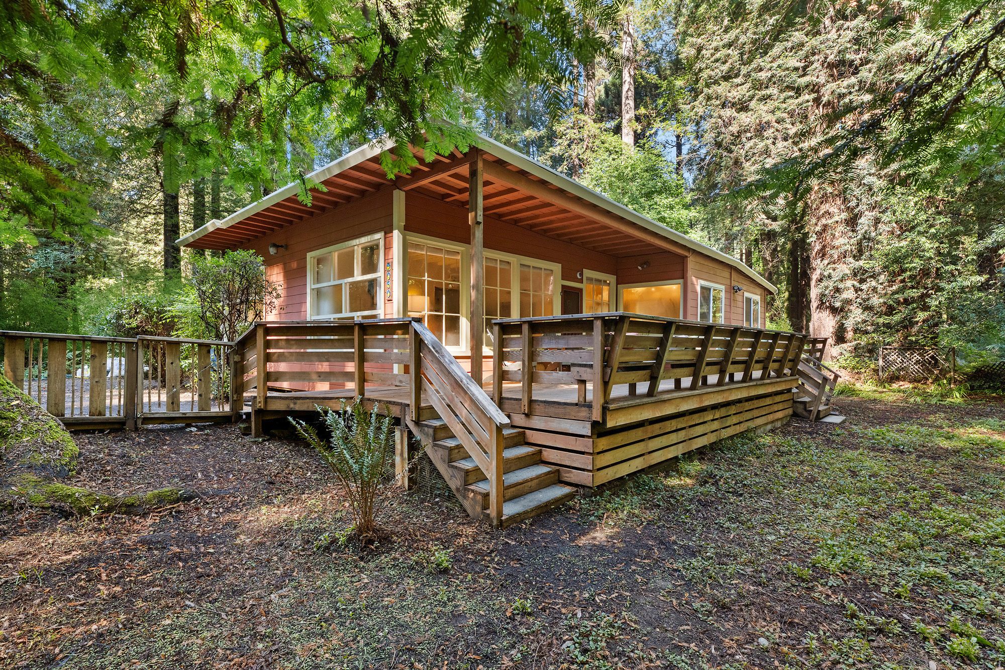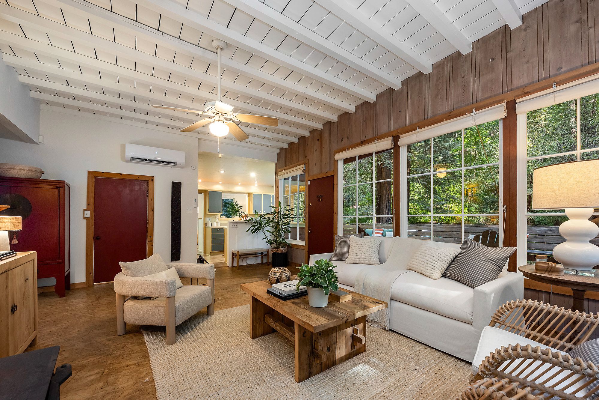 Surrounded by filtered sunlight and the quiet grace of towering trees, lies a truly rare offering: a lovingly maintained residence for the first time on the market in more than 40 years. Set on nearly half an acre, this 1,558 sqft home offers 2 bedrooms and 1 bath. Step into storybook charm via a broad, sun-soaked wrap-around deck with built-in bench seating, a gracious welcome, perfect for both quiet mornings and festive gatherings. Inside, you'll find exposed craft-beams, vaulted wood ceilings, and wood burning stoves with mini splits for instant heat, conjuring a refined yet rustic mid-century cabin-style aesthetic. Bright and open, the kitchen is gracefully positioned between the dining and family areas, where natural light pours in, creating a perfect flow for effortless entertaining. The primary suite is a serene retreat: imagine arched ceilings, wood beams, generous windows overlooking the forest, and exterior access to a spacious deck. Outside, a self-contained bonus space with a private entrance offers the perfect spot for guests, a creative studio, or a personal retreat. The level lot offers generous parking, including space for an RV or boat, and just a few doors down, you’ll find convenient access to Austin Creek, a peaceful escape for nature lovers and outdoor adventurers alike. A rare presentation: fully and truly one-of-a-kind. Don't miss this opportunity to own a piece of tranquil sophistication in Cazadero.