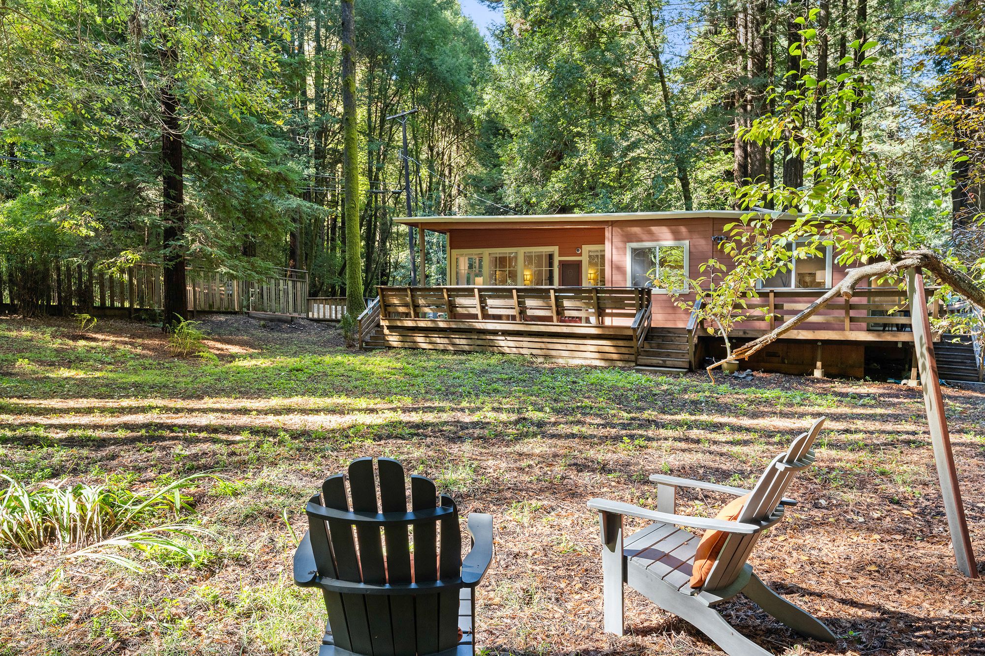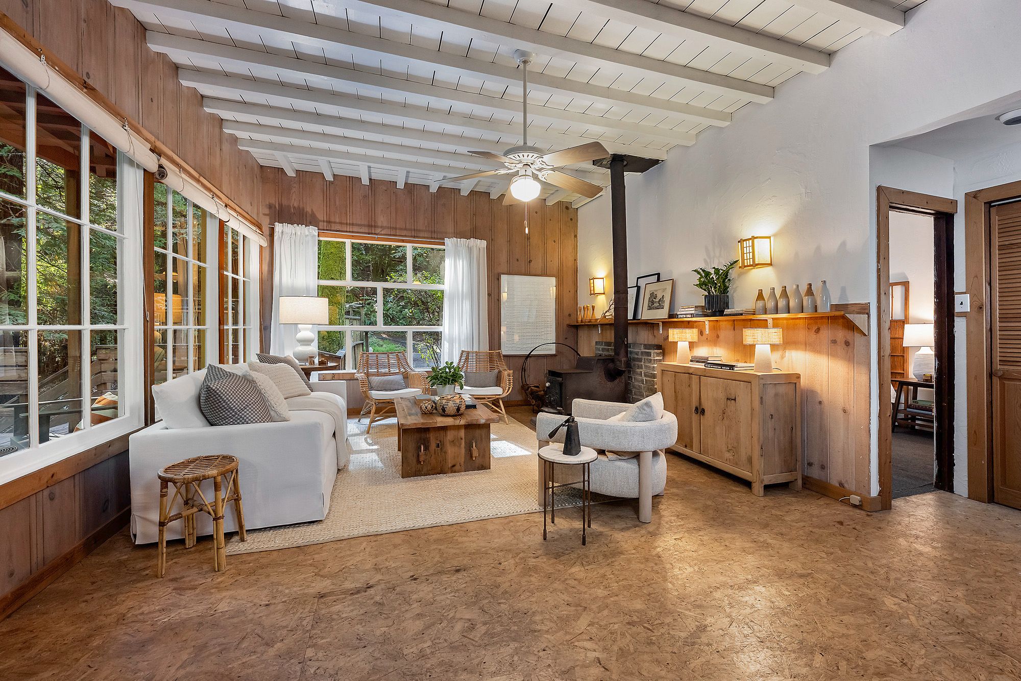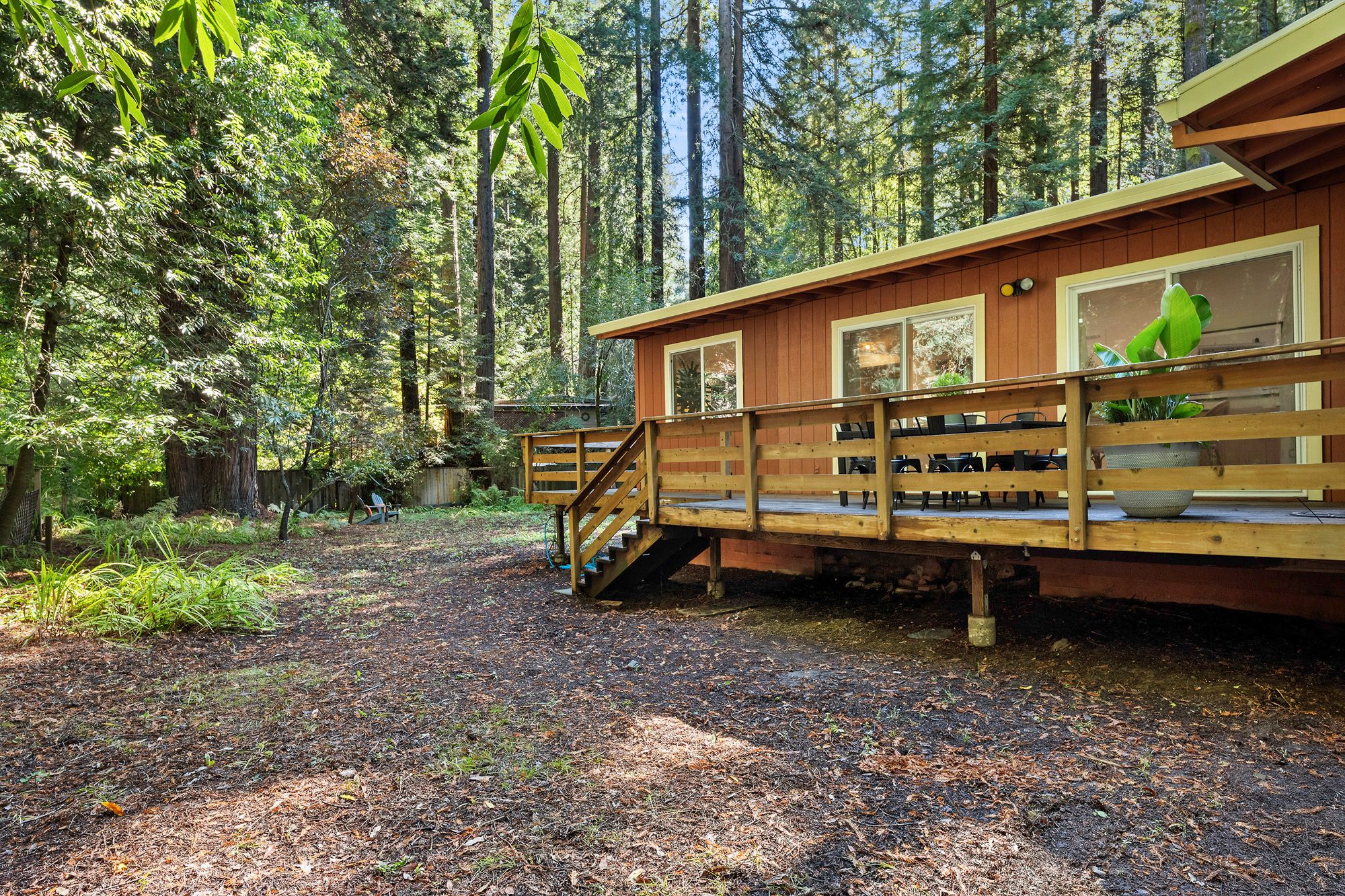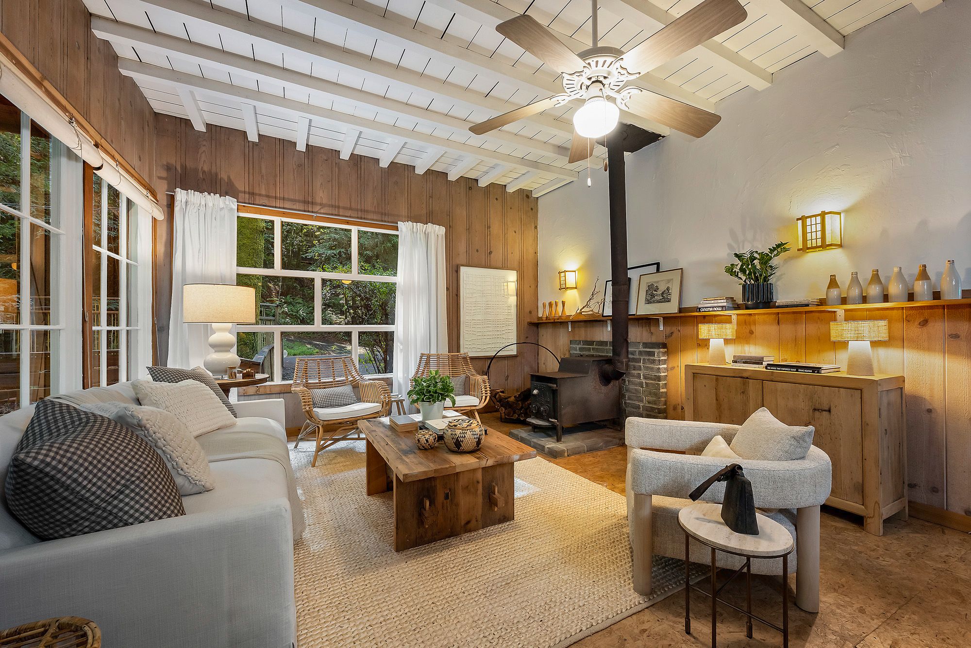 Surrounded by filtered sunlight and the quiet grace of towering trees, lies a truly rare offering: a lovingly maintained residence for the first time on the market in more than 40 years. Set on nearly half an acre, this 1,558 sqft home offers 2 bedrooms and 1 bath. Step into storybook charm via a broad, sun-soaked wrap-around deck with built-in bench seating, a gracious welcome, perfect for both quiet mornings and festive gatherings. Inside, you'll find exposed craft-beams, vaulted wood ceilings, and wood burning stoves with mini splits for instant heat, conjuring a refined yet rustic mid-century cabin-style aesthetic. Bright and open, the kitchen is gracefully positioned between the dining and family areas, where natural light pours in, creating a perfect flow for effortless entertaining. The primary suite is a serene retreat: imagine arched ceilings, wood beams, generous windows overlooking the forest, and exterior access to a spacious deck. Outside, a self-contained bonus space with a private entrance offers the perfect spot for guests, a creative studio, or a personal retreat. The level lot offers generous parking, including space for an RV or boat, and just a few doors down, you’ll find convenient access to Austin Creek, a peaceful escape for nature lovers and outdoor adventurers alike. A rare presentation: fully and truly one-of-a-kind. Don't miss this opportunity to own a piece of tranquil sophistication in Cazadero.