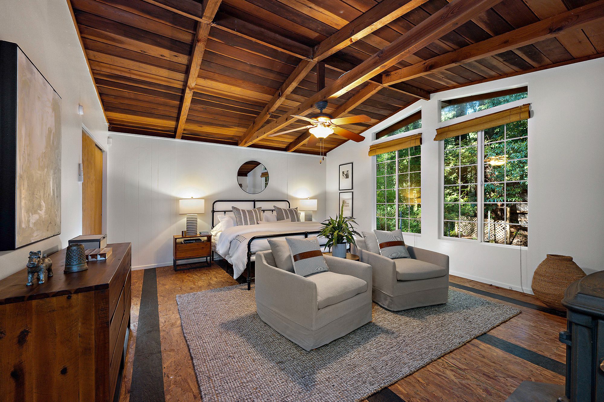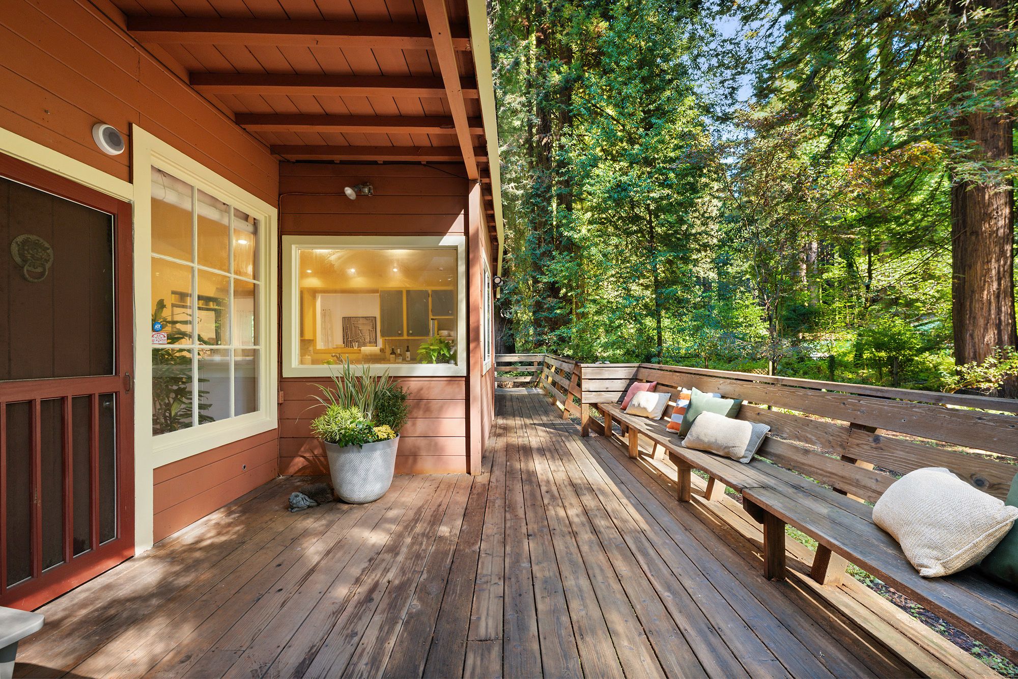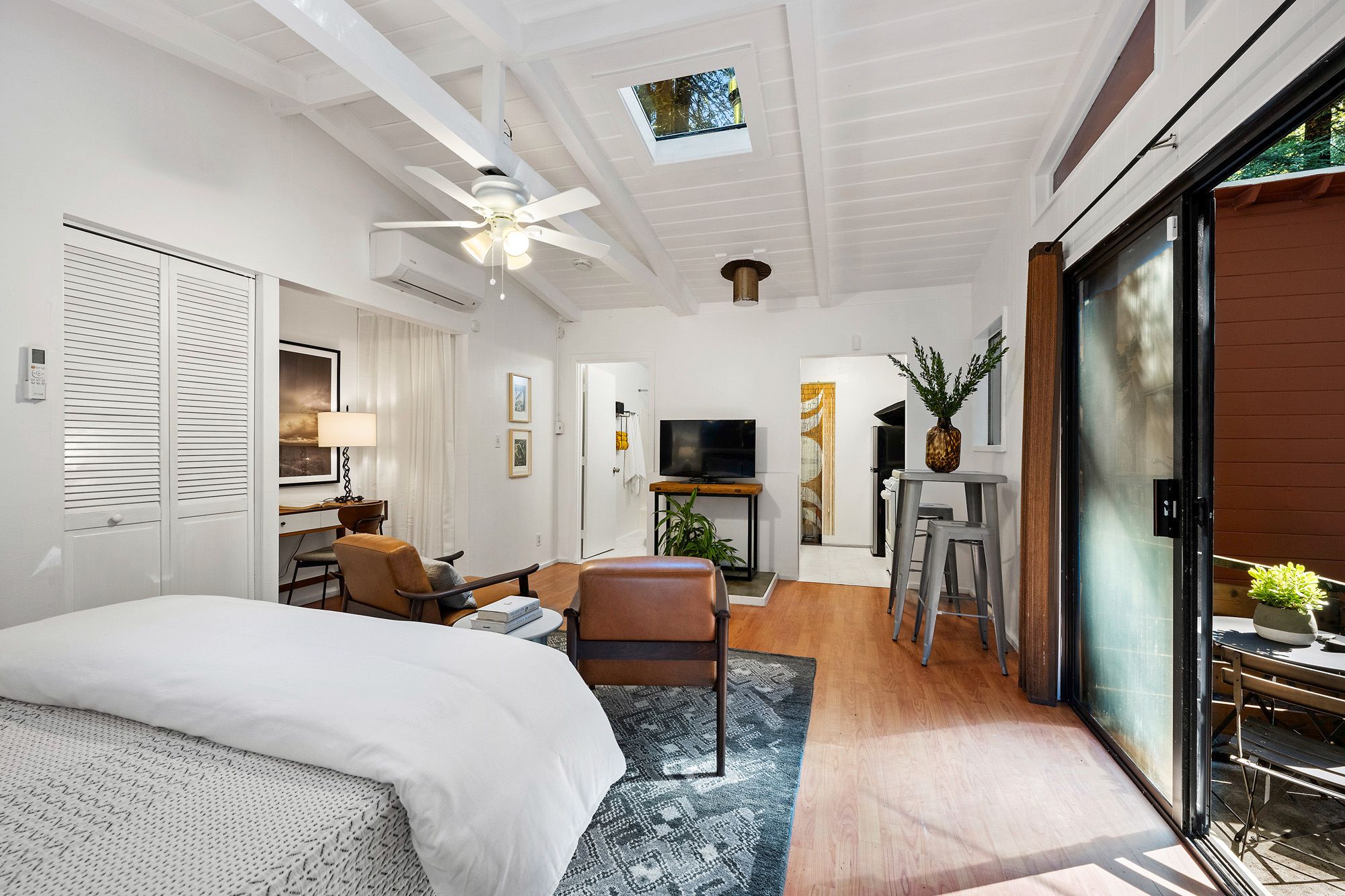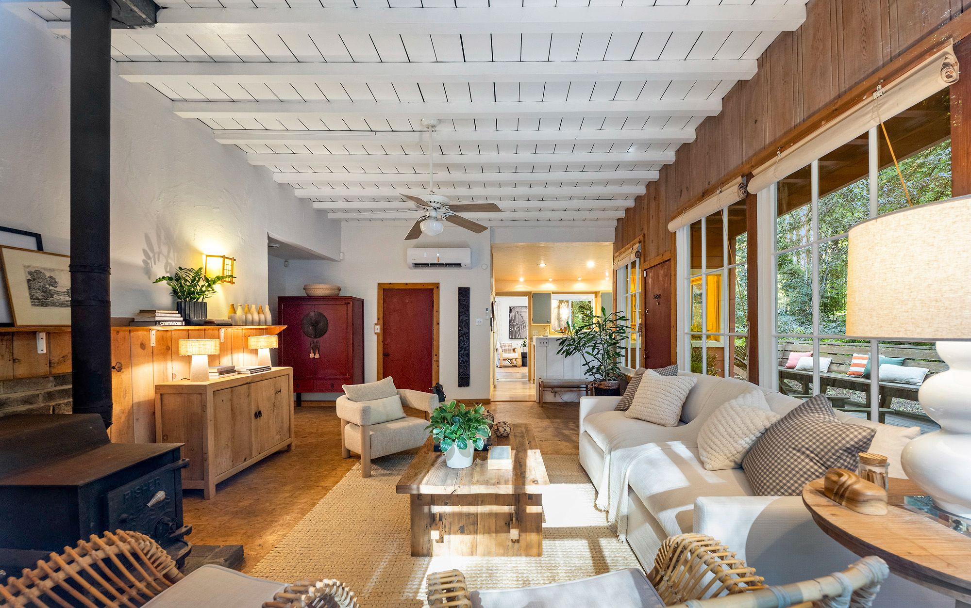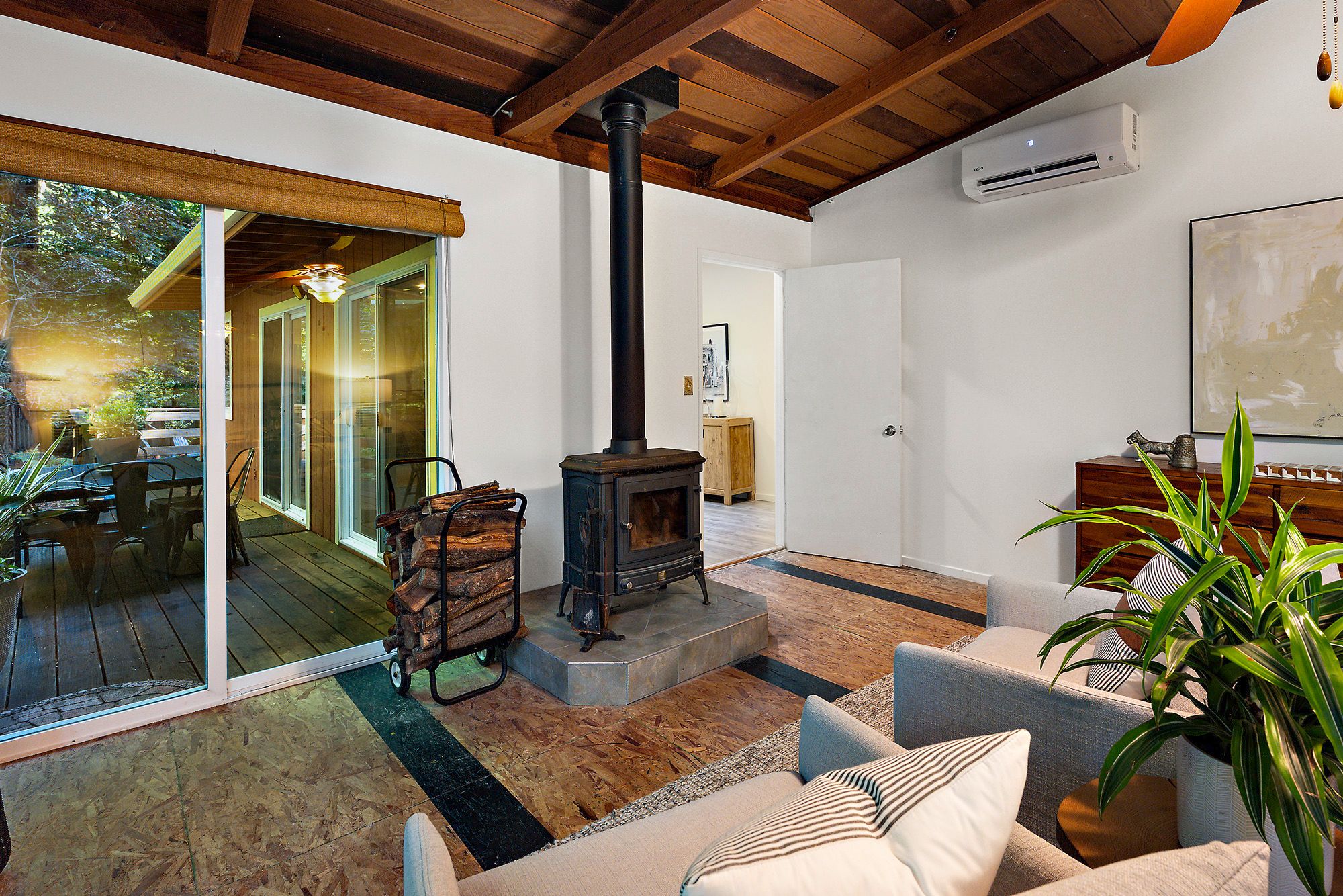 Surrounded by filtered sunlight and the quiet grace of towering trees, lies a truly rare offering: a lovingly maintained residence for the first time on the market in more than 40 years. Set on nearly half an acre, this 1,558 sqft home offers 2 bedrooms and 1 bath. Step into storybook charm via a broad, sun-soaked wrap-around deck with built-in bench seating, a gracious welcome, perfect for both quiet mornings and festive gatherings. Inside, you'll find exposed craft-beams, vaulted wood ceilings, and wood burning stoves with mini splits for instant heat, conjuring a refined yet rustic mid-century cabin-style aesthetic. Bright and open, the kitchen is gracefully positioned between the dining and family areas, where natural light pours in, creating a perfect flow for effortless entertaining. The primary suite is a serene retreat: imagine arched ceilings, wood beams, generous windows overlooking the forest, and exterior access to a spacious deck. Outside, a self-contained bonus space with a private entrance offers the perfect spot for guests, a creative studio, or a personal retreat. The level lot offers generous parking, including space for an RV or boat, and just a few doors down, you’ll find convenient access to Austin Creek, a peaceful escape for nature lovers and outdoor adventurers alike. A rare presentation: fully and truly one-of-a-kind. Don't miss this opportunity to own a piece of tranquil sophistication in Cazadero.