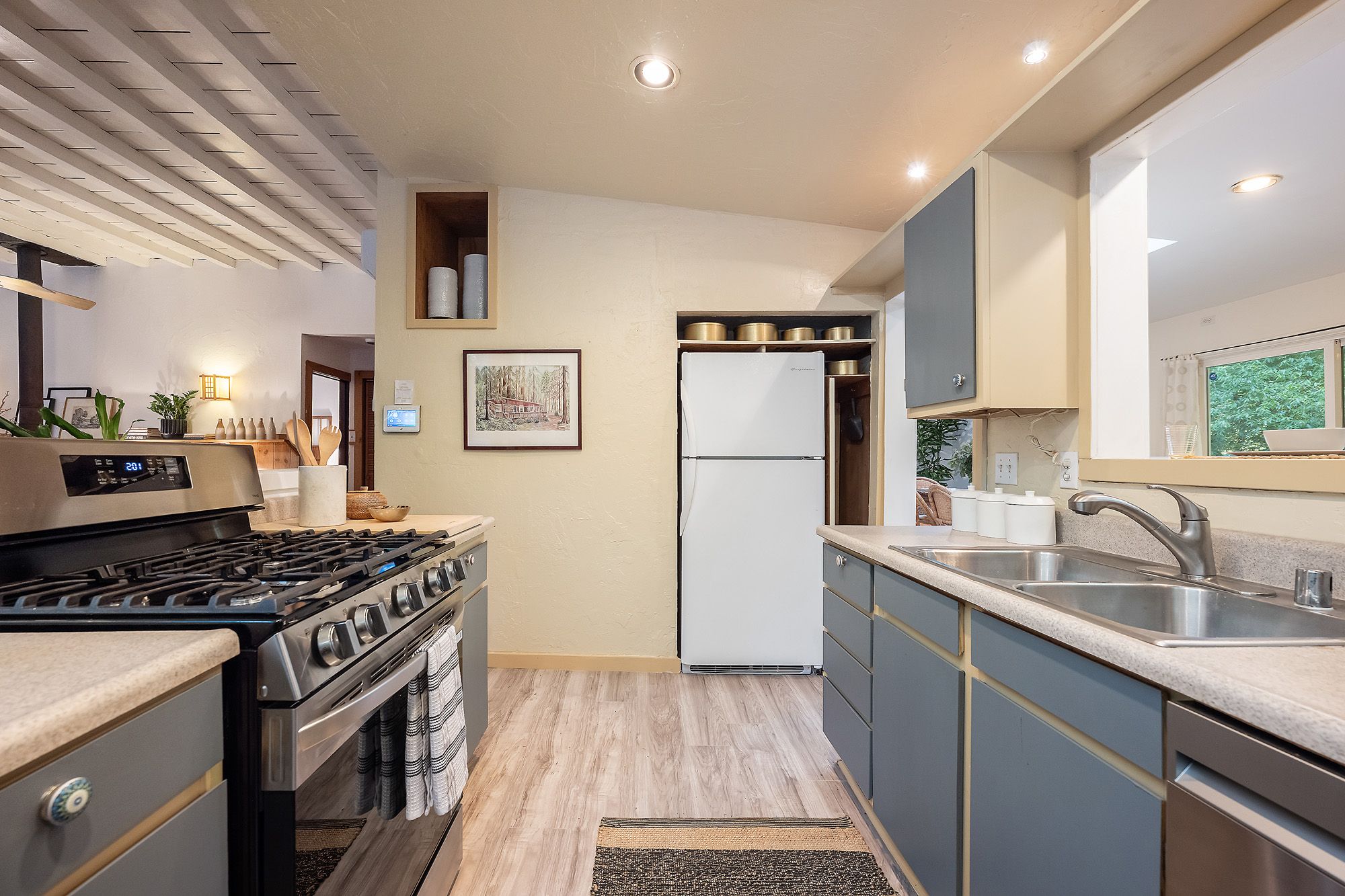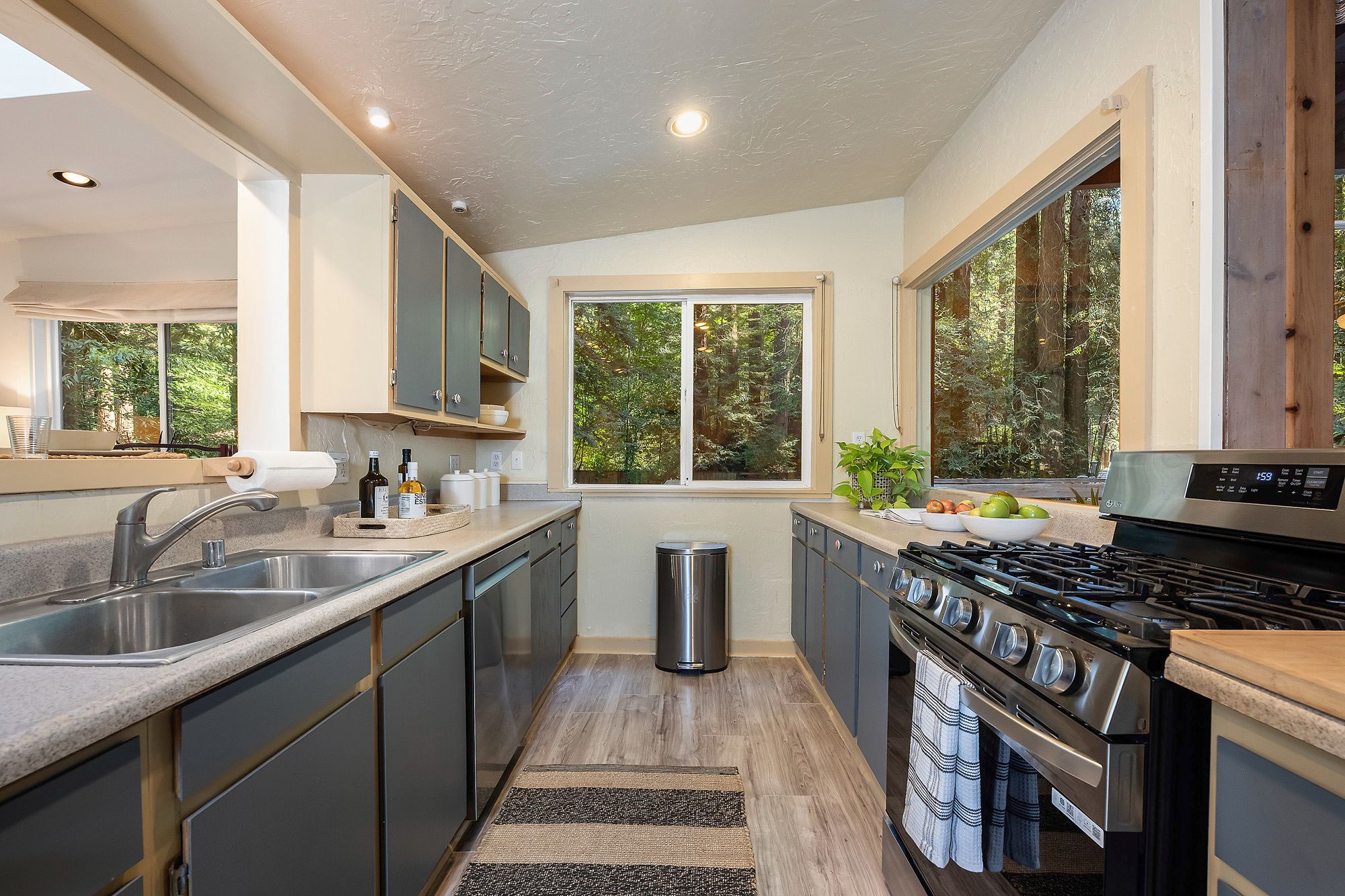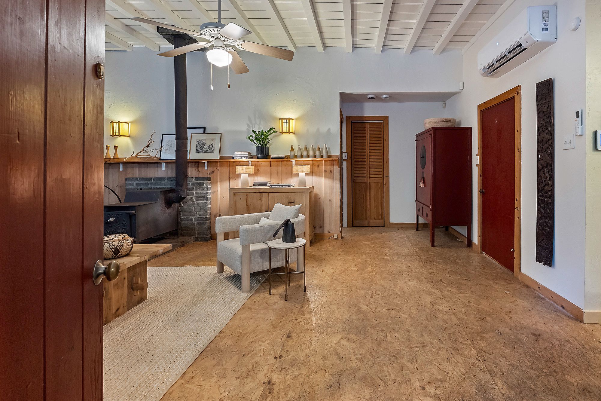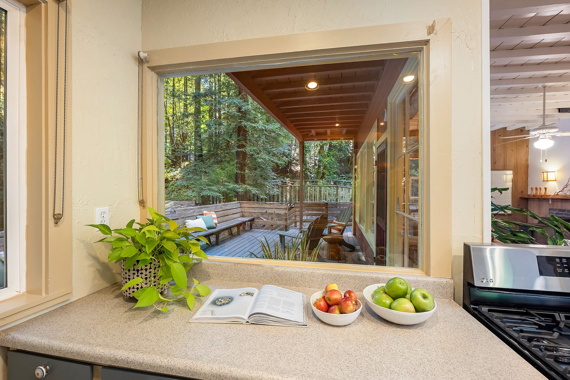 Surrounded by filtered sunlight and the quiet grace of towering trees, lies a truly rare offering: a lovingly maintained residence for the first time on the market in more than 40 years. Set on nearly half an acre, this 1,558 sqft home offers 2 bedrooms and 1 bath. Step into storybook charm via a broad, sun-soaked wrap-around deck with built-in bench seating, a gracious welcome, perfect for both quiet mornings and festive gatherings. Inside, you'll find exposed craft-beams, vaulted wood ceilings, and wood burning stoves with mini splits for instant heat, conjuring a refined yet rustic mid-century cabin-style aesthetic. Bright and open, the kitchen is gracefully positioned between the dining and family areas, where natural light pours in, creating a perfect flow for effortless entertaining. The primary suite is a serene retreat: imagine arched ceilings, wood beams, generous windows overlooking the forest, and exterior access to a spacious deck. Outside, a self-contained bonus space with a private entrance offers the perfect spot for guests, a creative studio, or a personal retreat. The level lot offers generous parking, including space for an RV or boat, and just a few doors down, you’ll find convenient access to Austin Creek, a peaceful escape for nature lovers and outdoor adventurers alike. A rare presentation: fully and truly one-of-a-kind. Don't miss this opportunity to own a piece of tranquil sophistication in Cazadero.